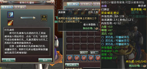 小贴士:打孔的数量跟打孔道具有关,数量分别为1孔、2孔、3孔;打孔装备必须为“可打孔”的装备,否则不可给装备打孔。