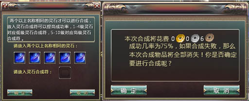 小贴士:3颗灵石合成成功几率为25%,4颗灵石合成成功几率为50%,5可灵石合成成功几率为75%;放入灵石合成符可以提高合成几率;如失败,用于合成的灵石将全部消失。